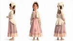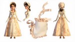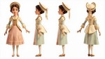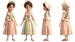 A beautiful 16-year-old noble girl with brown eyes in France, 1789, depicted in semi-realistic Pixar style, French noble lady in 1800s wears pastel gowns with lace, embroidery, peplum jacket, bonnet tied with satin ribbon from the cap tied to under her chin with a delicate satin bowadds a graceful, noble elegance. She wears lace gloves, and dainty heeled shoes. Her expression is gentle, mature, and full of quiet confidence. Full body character sheet on white background, front, right side, back views, with 3 expressions