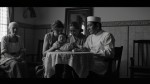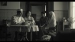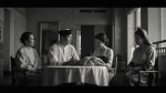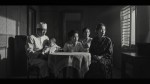 A cinematic black-and-white scene of a traditional Southeast Asian family from the 1940s, inside a modest colonial-era home. A dignified man in a white formal uniform and traditional peci hat sits calmly at a round table covered with lace. A woman in a simple vintage dress gently holds a baby wrapped in cloth, standing beside him. Two elder women in traditional kebaya and batik sarongs are also present, one seated with a graceful posture. The room features classic tile walls, wooden furniture, and a large standing mirror in the background. The atmosphere is quiet and respectful, evoking a sense of patriotism, unity, and resilience. Ultra-detailed, hyper-realistic lighting, historical photography look, monochrome color palette, 1940s Indonesian setting, cinematic realism. no modern clothing, no bright colors, no glasses, no electronic items, no futuristic details, no Western fashion, no weapons, no fantasy elements.