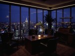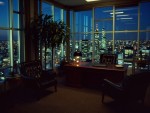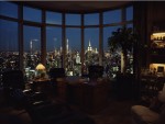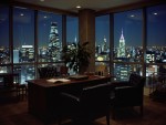 Luxurious 1980s Office Interior with Black Leather Chairs, Wooden Desk and New York City Night View