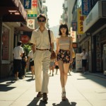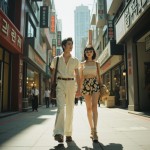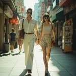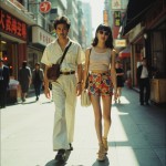 1990s Korean Couple Walking in Myeongdong, Seoul in Summer Fashion