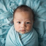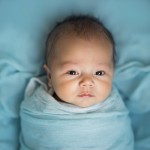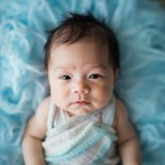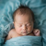 Overhead Shot of a 15-Day-Old Baby on Soft Sky-Blue Fabrics, Soft Light