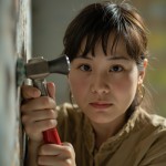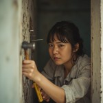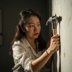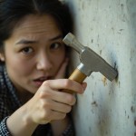 Confused Asian Woman in Her 30s Hammering Nail into Wall