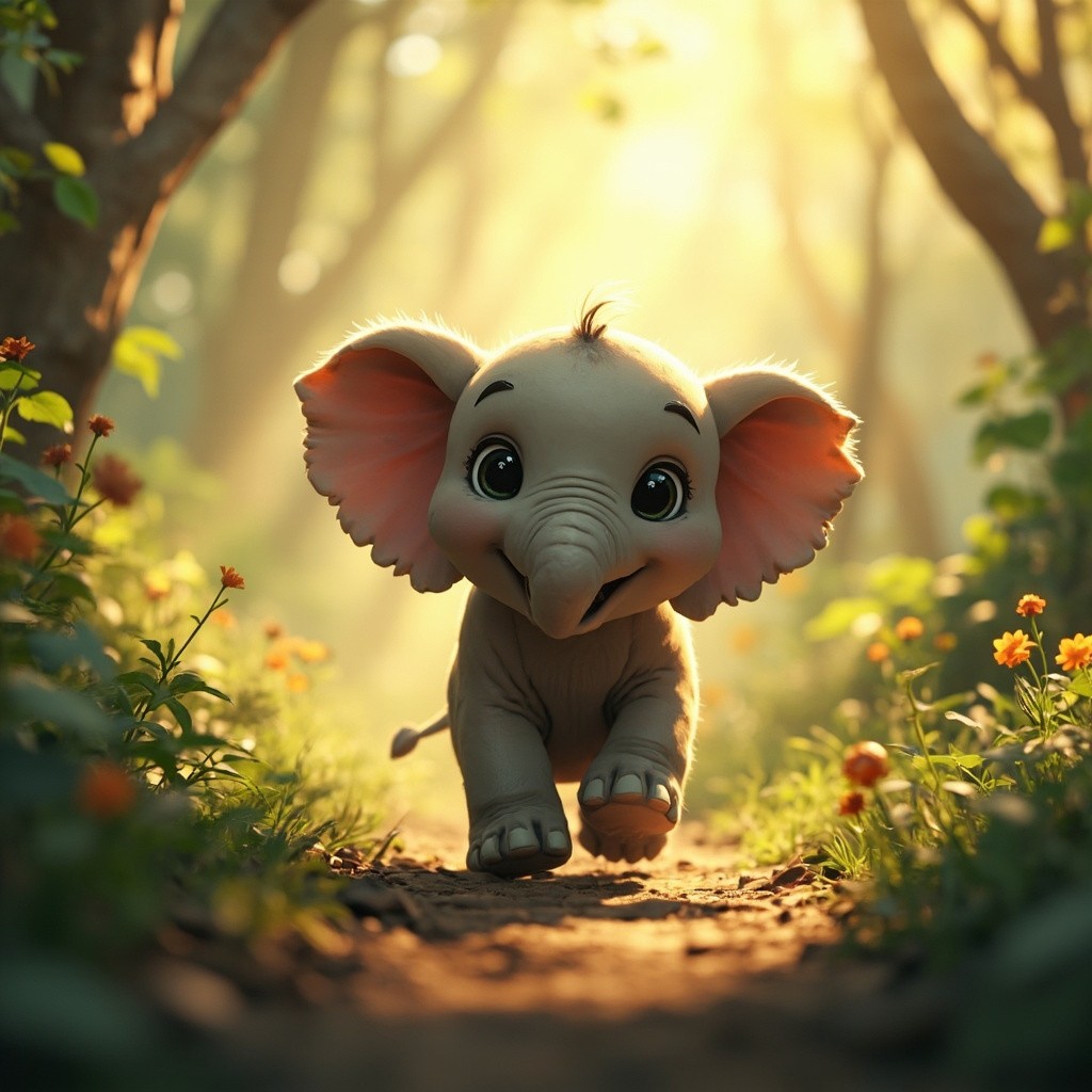 Baby Elephant Walking in Colorful Jungle Sunlight