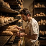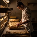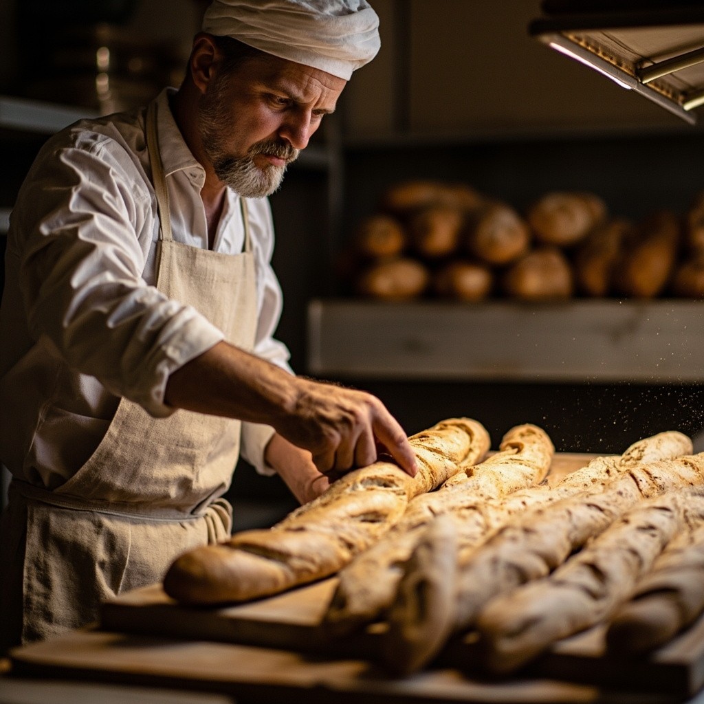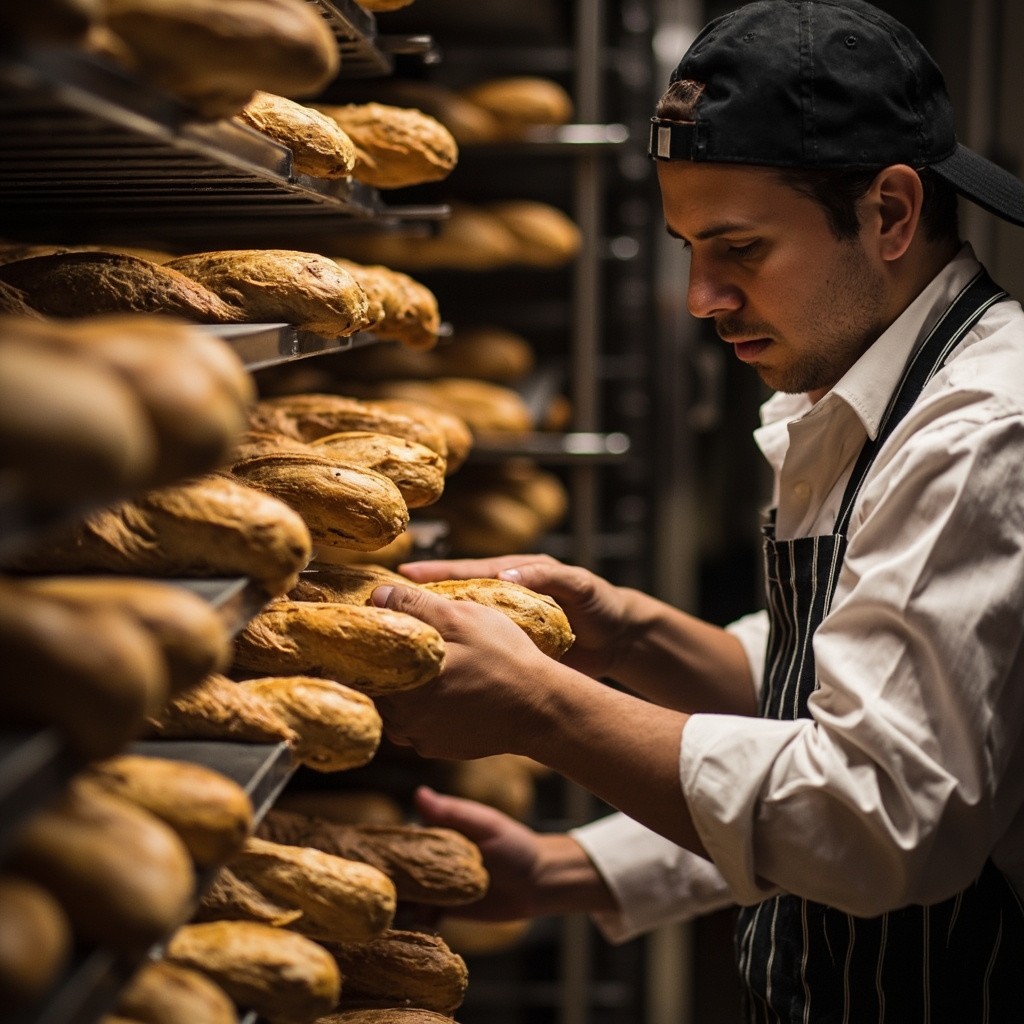 Baker Cooking Baguettes in His Bakery