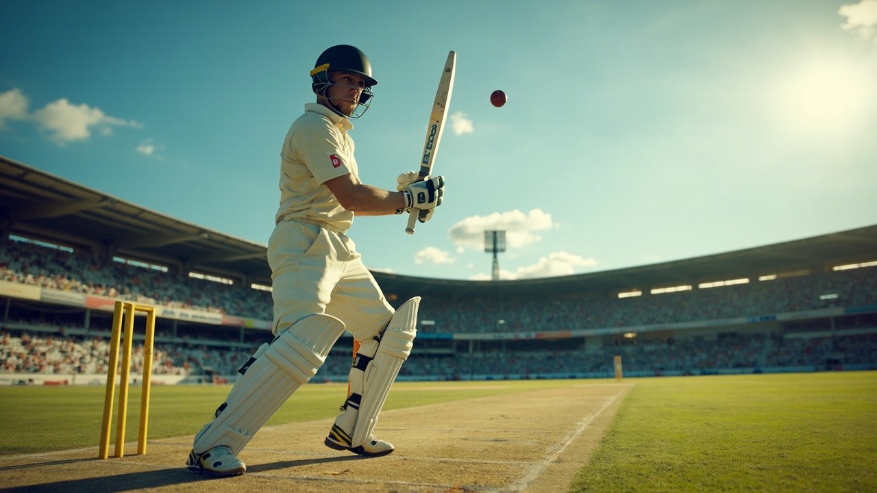 Cricket Batsman Hitting Ball on Pitch with Stadium