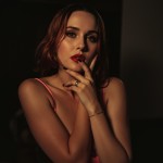 Beautiful 40-Year-Old Woman with Red Blush and Red Nail Polish