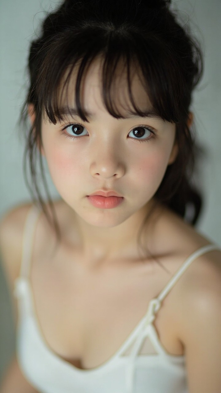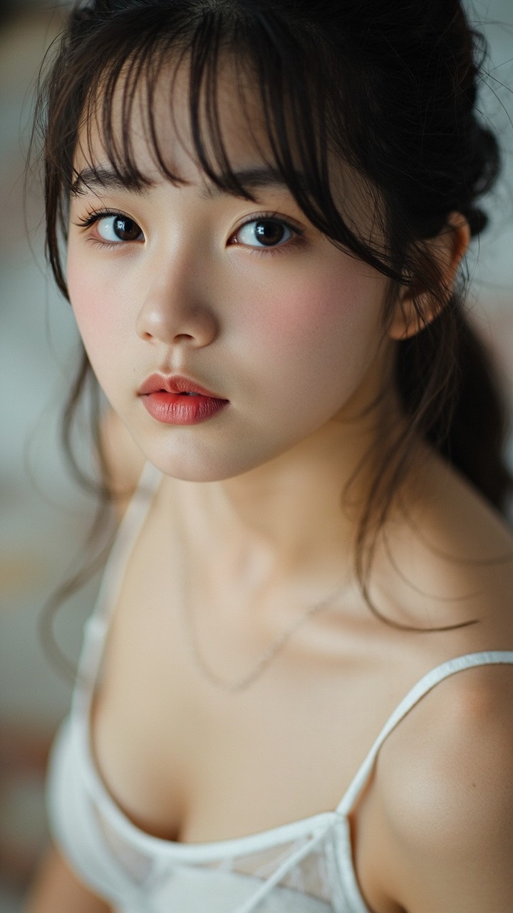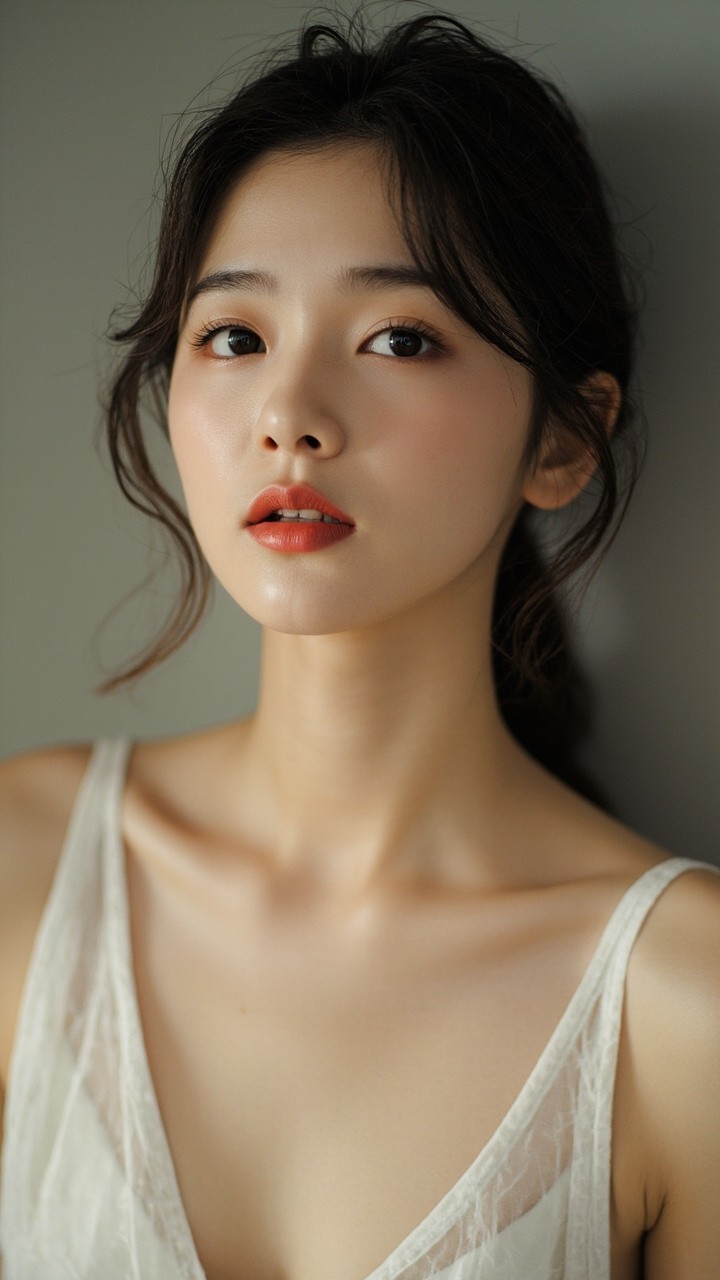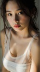 Beautiful Young Korean Girl in White Tank Top Close-Up