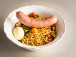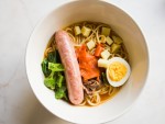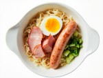 Bird's-Eye View of Instant Noodles with Ham, Egg, and Vegetables in White Ceramic Bowl