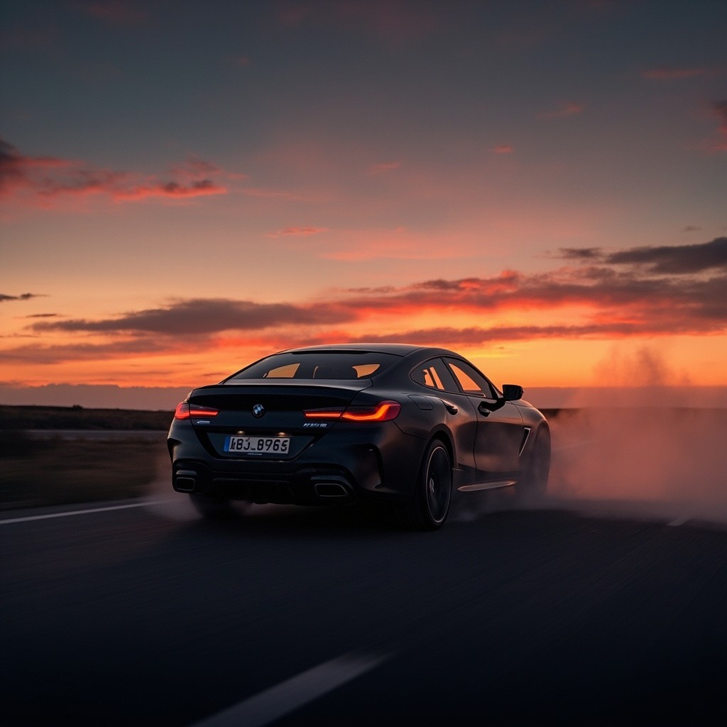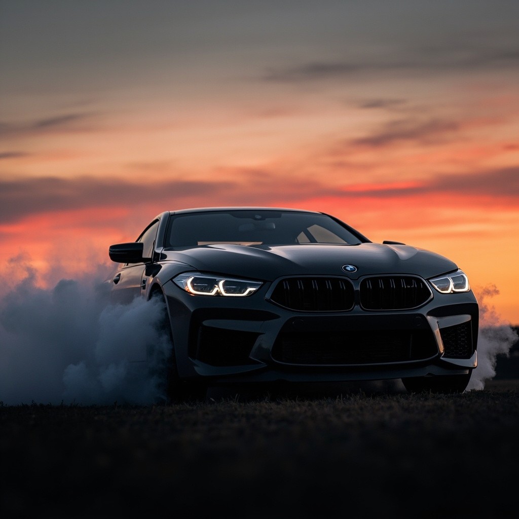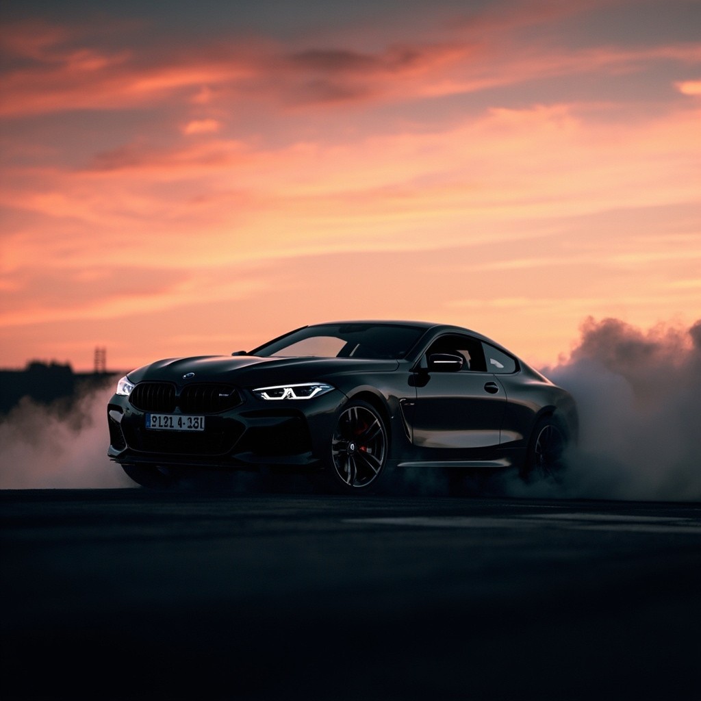 Black BMW M8 Drifting Under Reddish-Orange Evening Sky