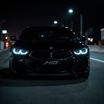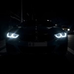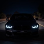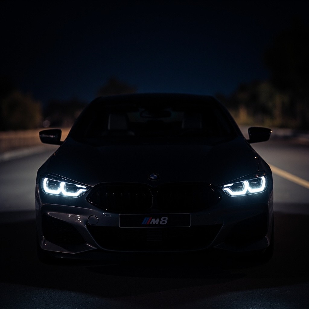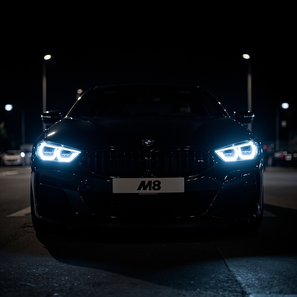 Black BMW M8 at Night Showing Headlights, Logo, and M8 Plate