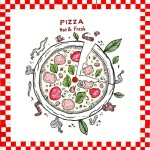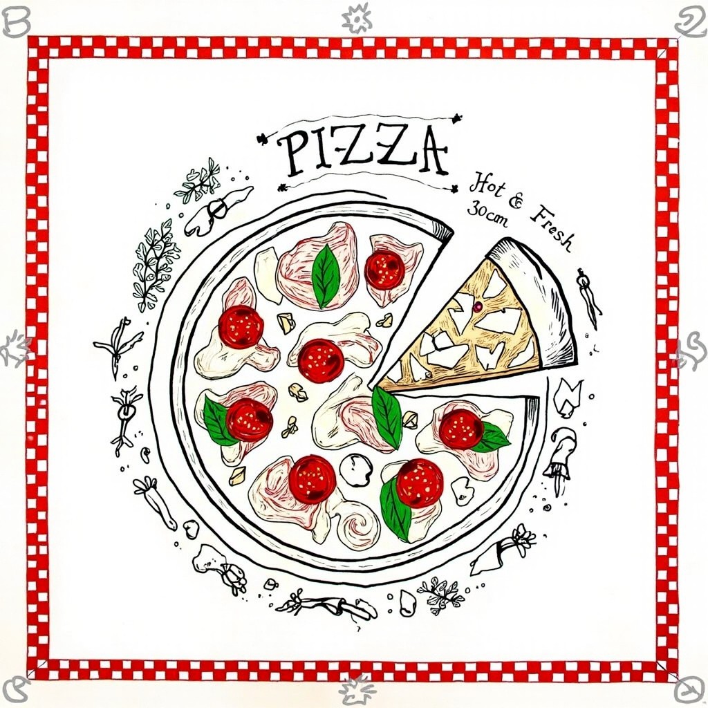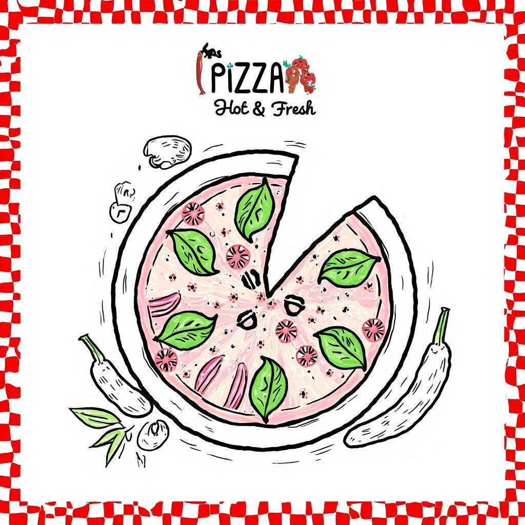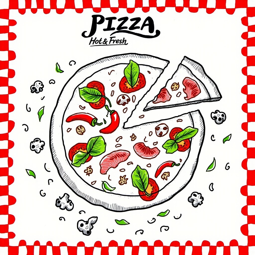 Black Line Art of Pizza with Fresh Ingredients and Artistic Text in Red, Green, White