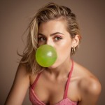 Blonde Woman in Pink Bikini Blowing Green Bubble Gum