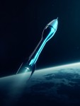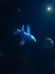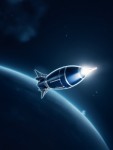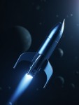 Blue Metal Rocket Flying in Dark Space with Stars and Planets
