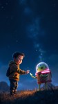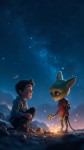 Boy Meeting Friendly Alien Under Star-Lit Sky