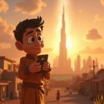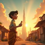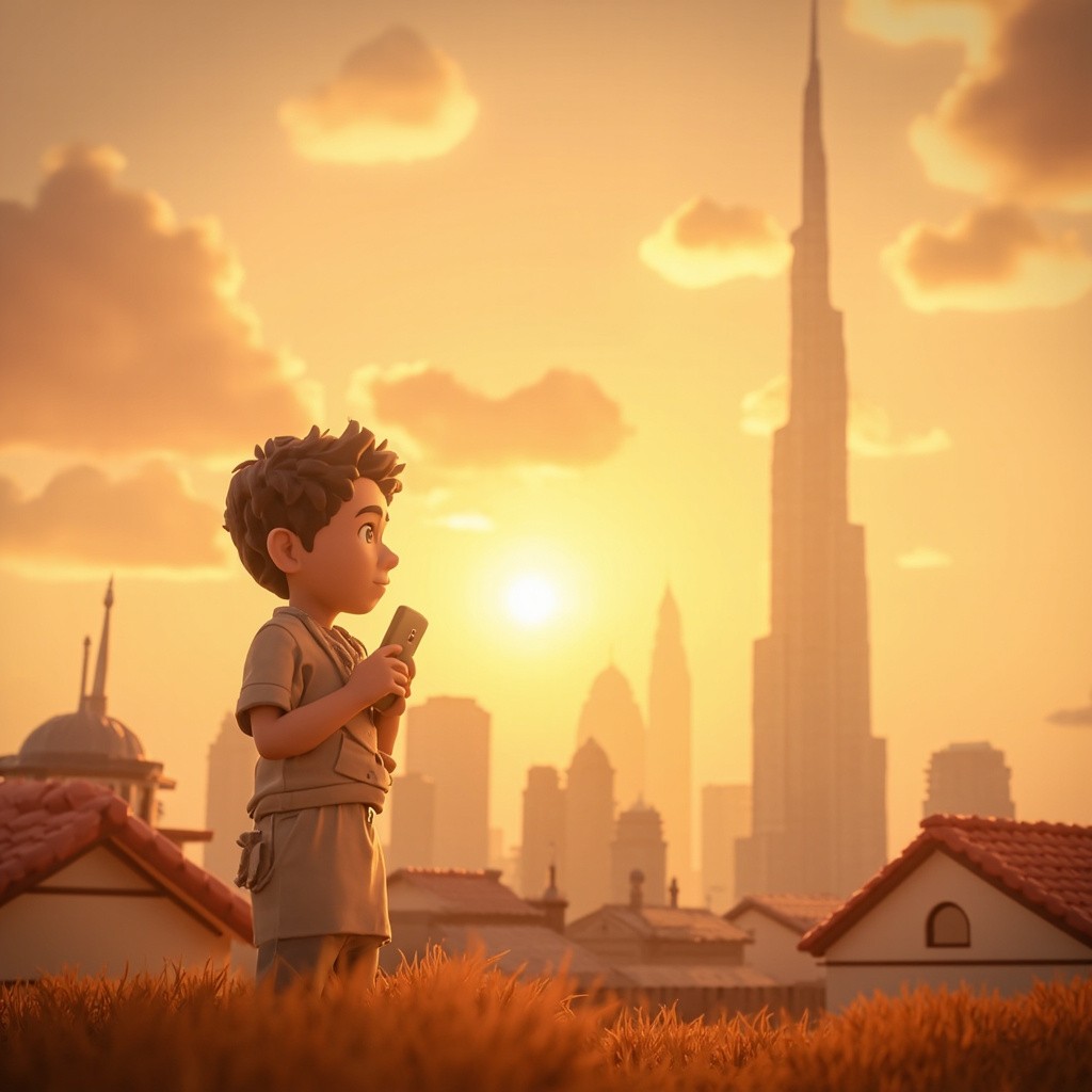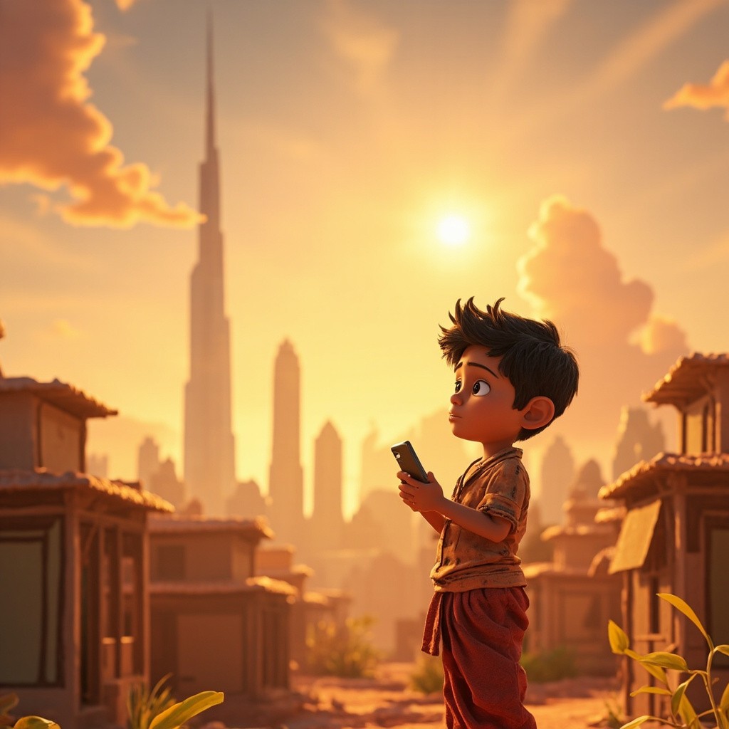 Indian Village Boy Looking at Dubai Skyline Cartoon, 3D Illustration