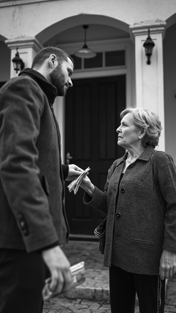 Black and White Image of Boy Giving Money to Mother Outside Home
