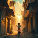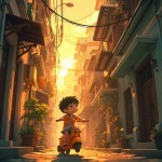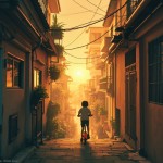 Young Boy Riding Scooter Up Urban Alley at Sunrise