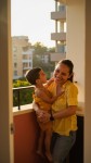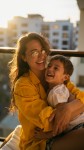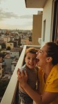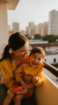 A joyful Brazilian mother and her young son laughing together on the balcony of a modern apartment in São Paulo, Brazil, the mother wearing a bright yellow shirt, typical Curitiba urban neighborhood in the background, warm late afternoon sunlight, cozy and relaxed atmosphere, realistic photographic style.