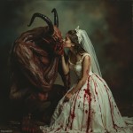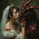 Realistic Illustration of Bride with Blood Splashes Kissing Demon