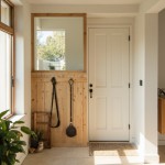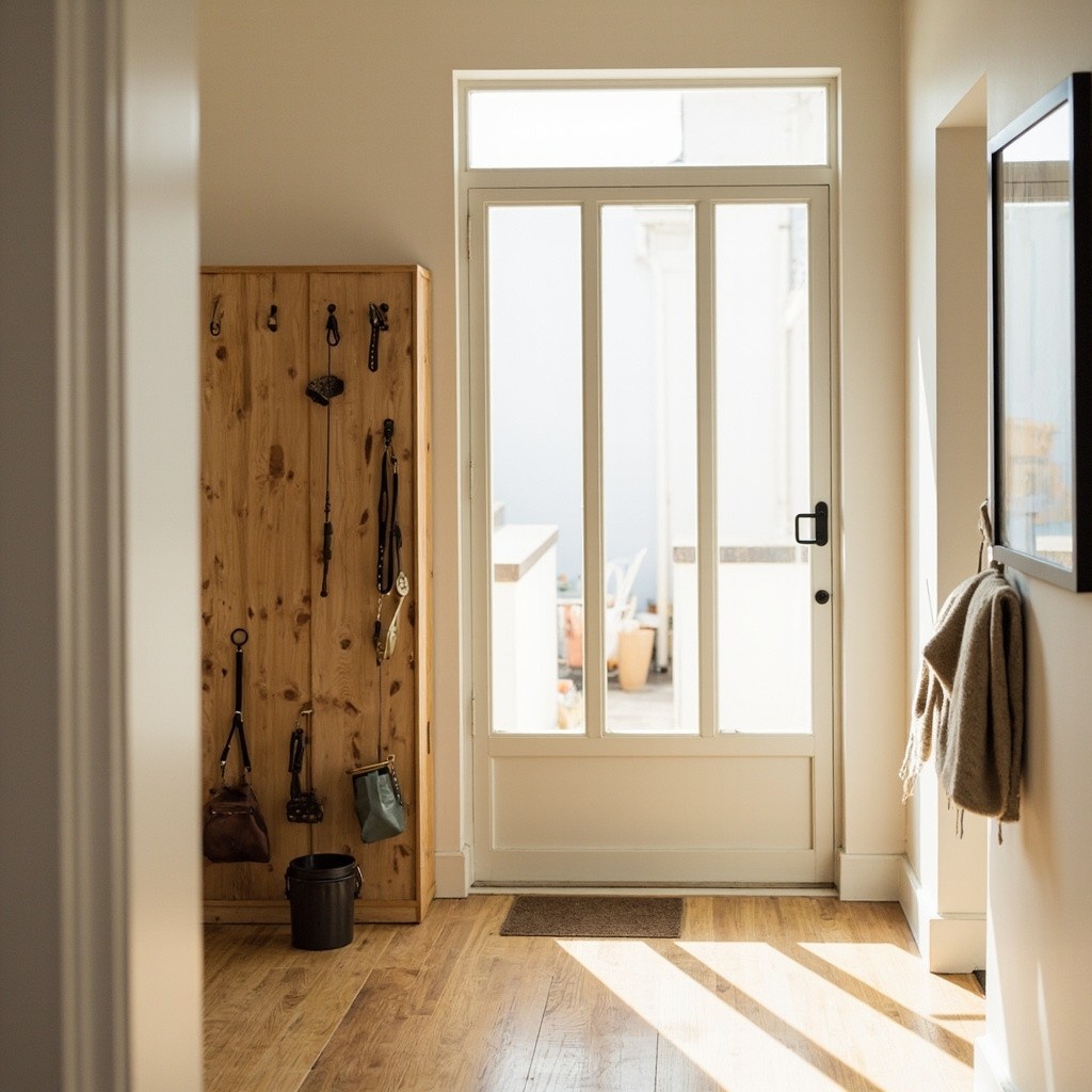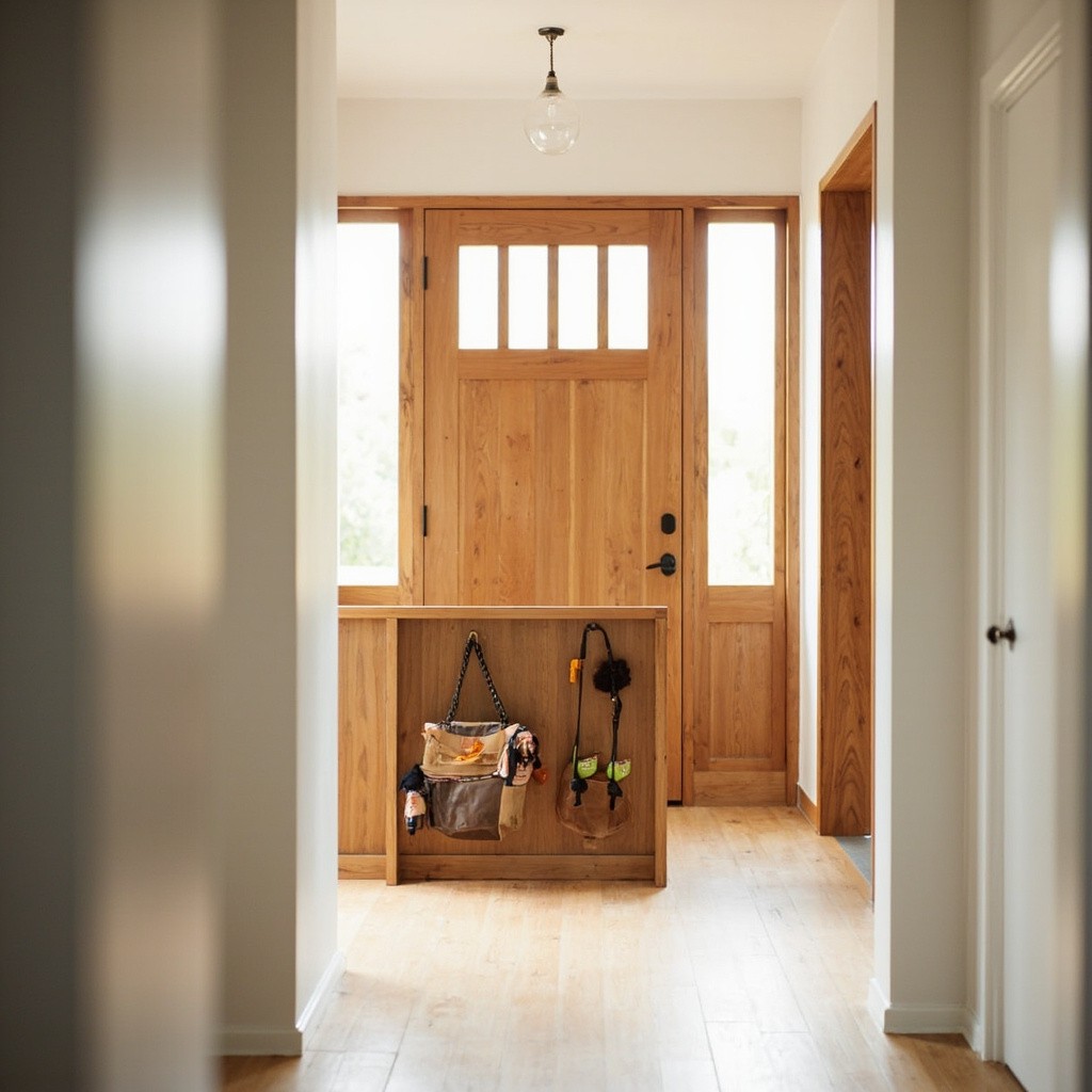 Modern Minimalist Interior, Wooden Partition Wall in Entryway with Dog Walking Supplies