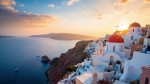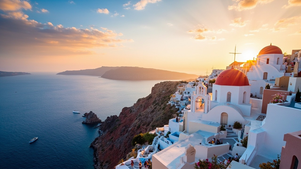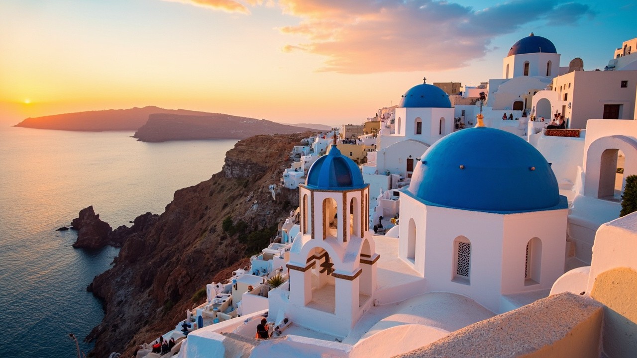 Aerial View of Santorini in Summer with Colorful Sky