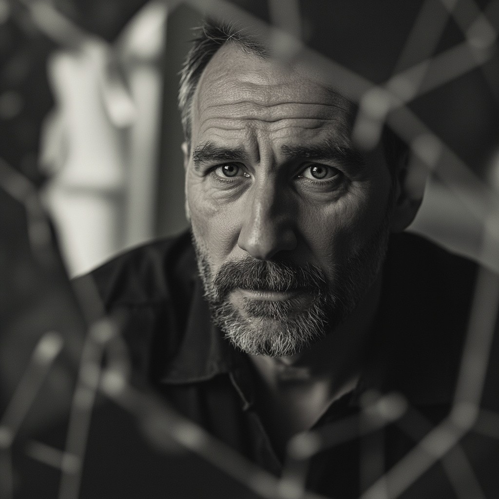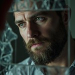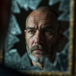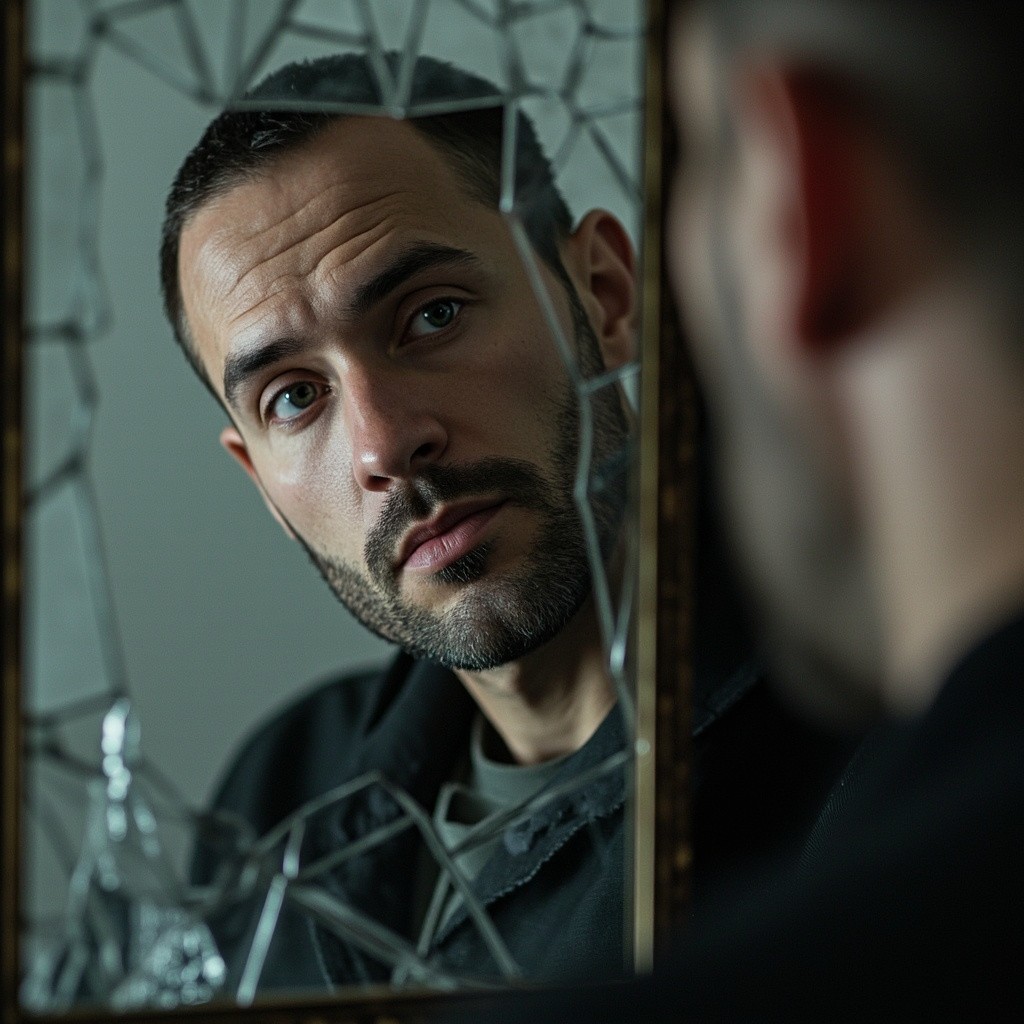 Shattered Mirror Reflecting Middle-Aged Russian Man Without Beard