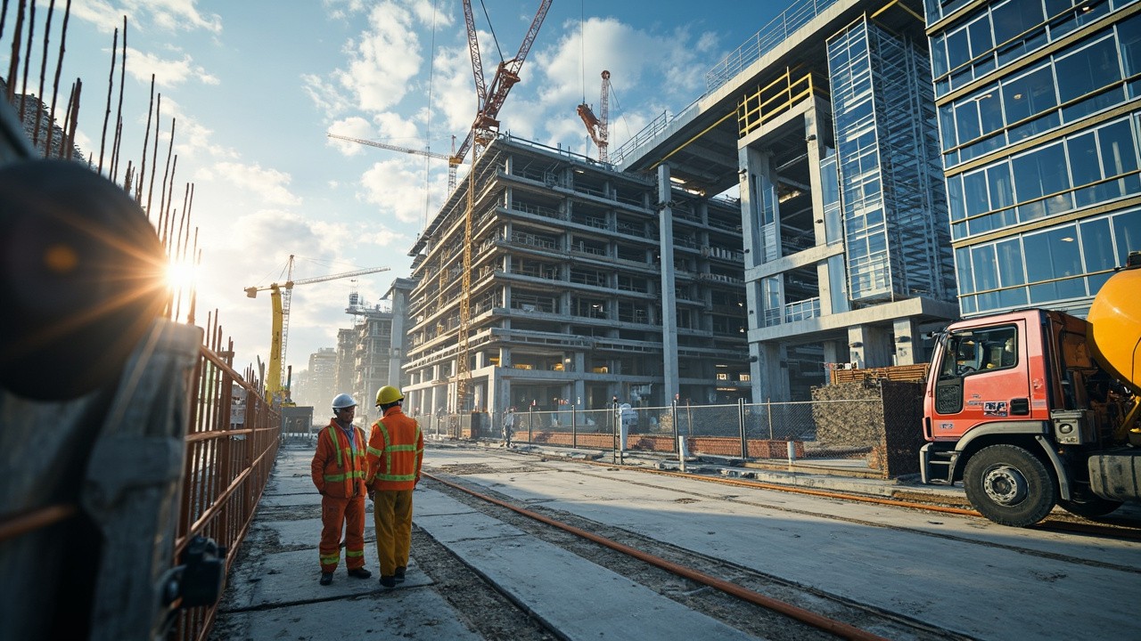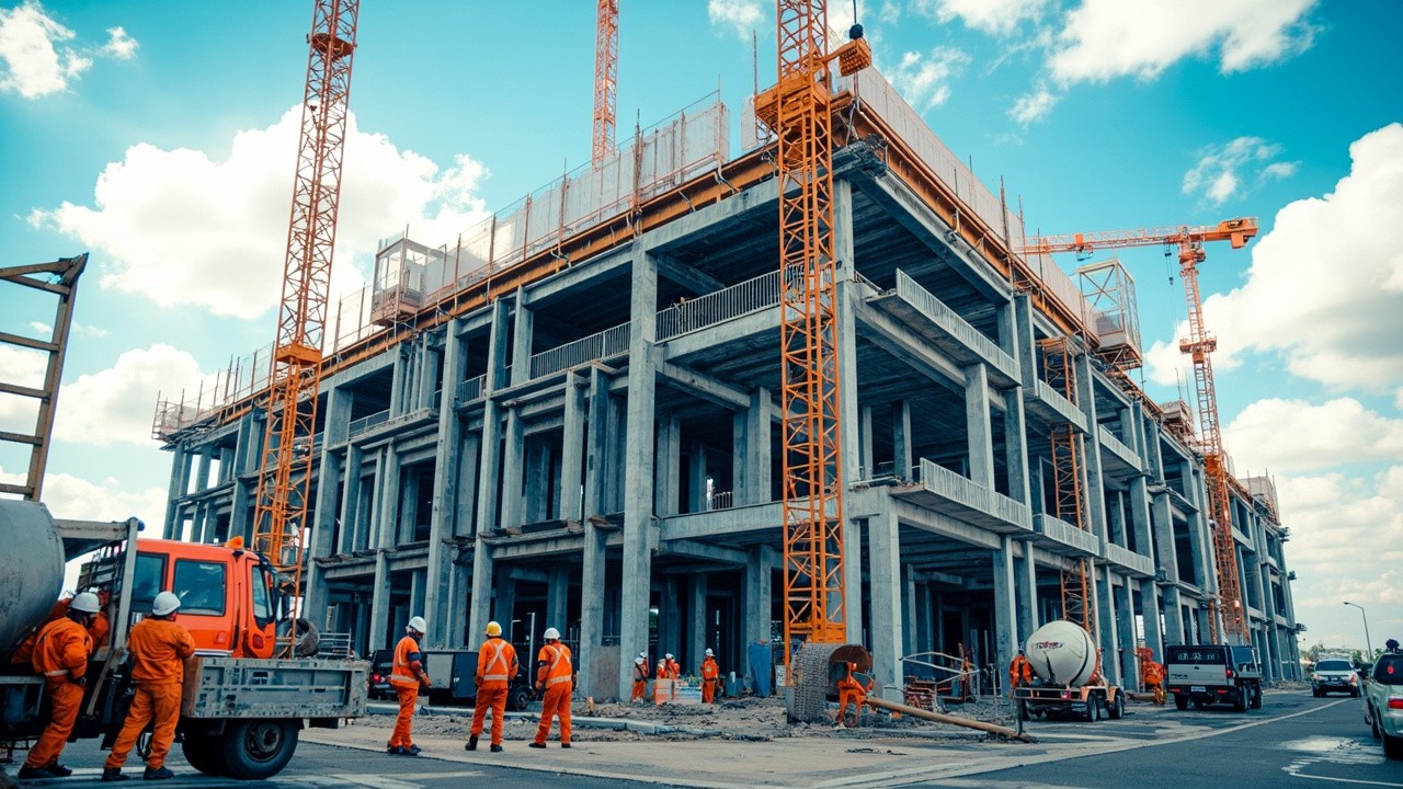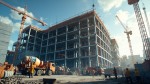 Modern Building Construction Scene with Workers and Equipment