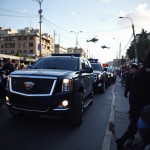 Parade of Cadillac Escalade Cars Escorting Police Motorcycles Among Crowd of Orthodox Jews