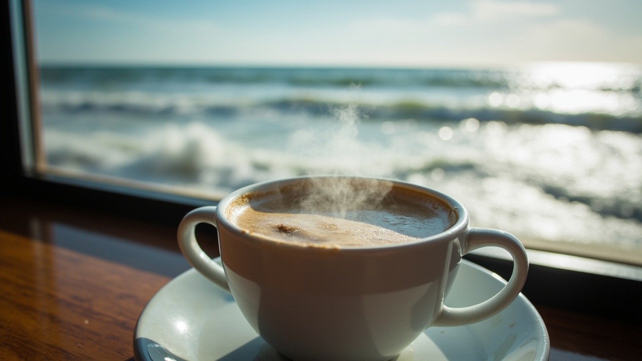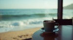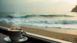 Beachside Cafe Window with Steaming Coffee Cup and Incoming Waves