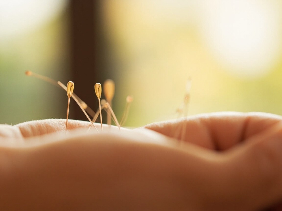 Minimalist close-up photo of delicate acupuncture needles delicately inserted into a person's hand. Natural, soft daylight from a window. High detail on the needle and the surrounding skin. Warm tones, clean composition, bokeh background. Focus on peace and natural healing. Perfect for wellness and aesthetic medicine content