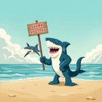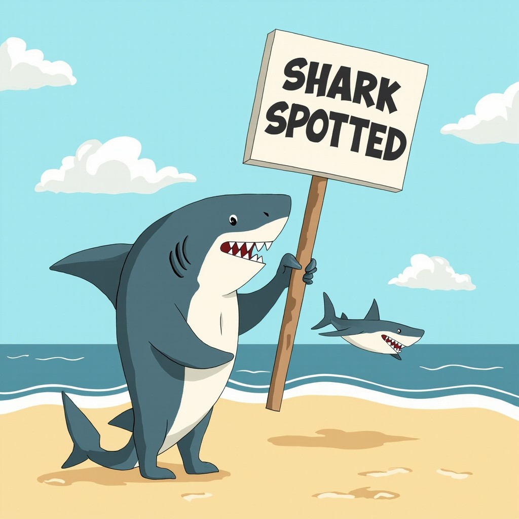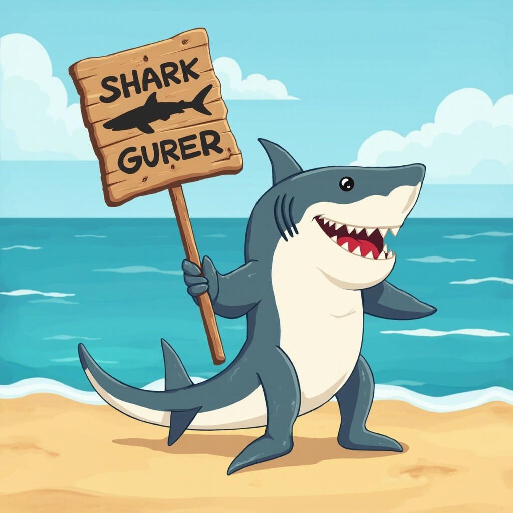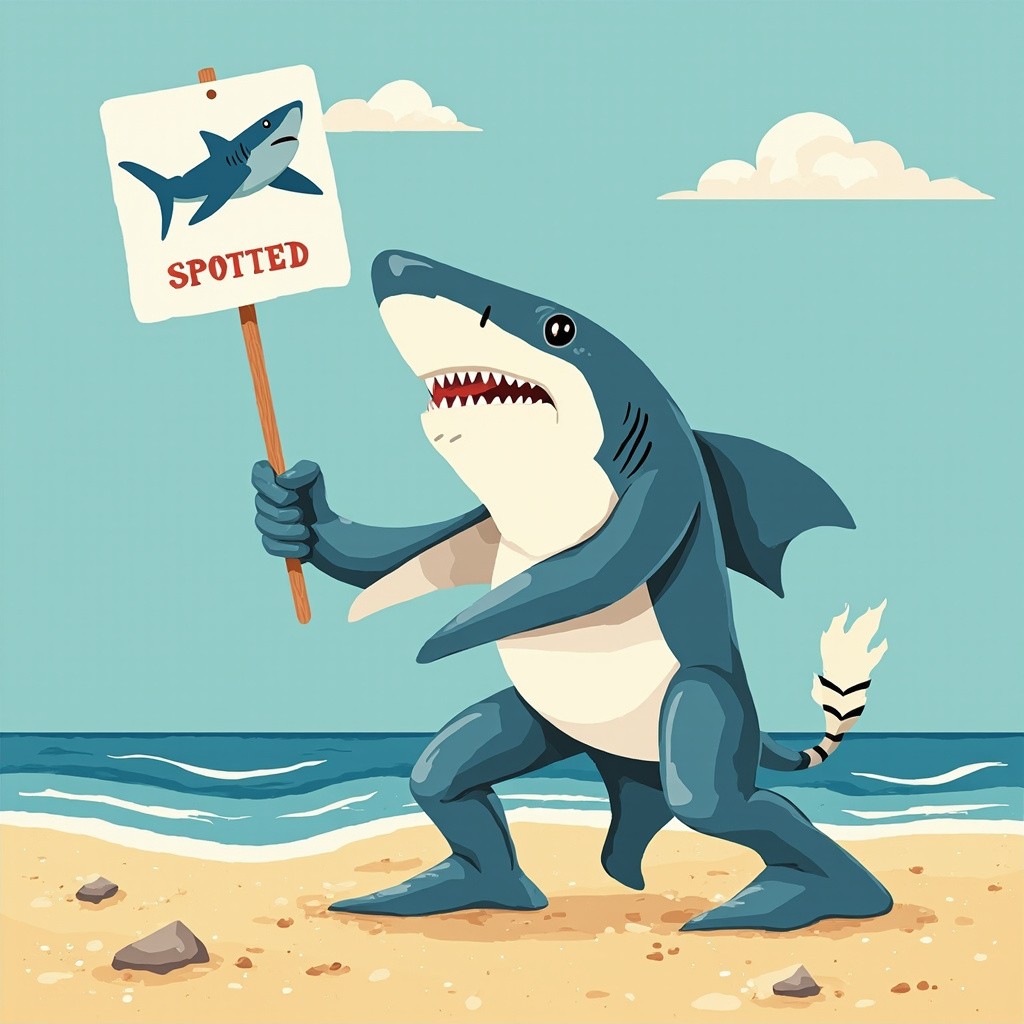 Cartoonish Small Shark Holding Spotted Sign on Beach
