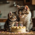Cat and Kitten Celebrating Birthday with Cake in Kitchen