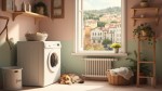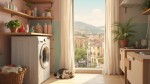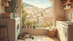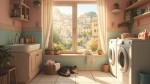Cozy Pastel Laundry Room with Cat, Basket, Wooden Shelves, and Italian Village View