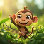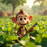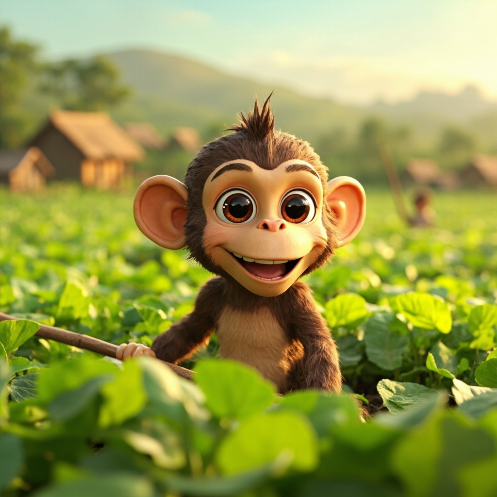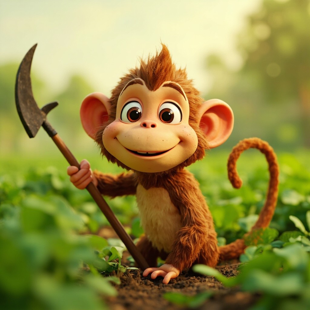 Colorful 3D Farm Scene with Smiling Monkey Holding Hoe Cartoon