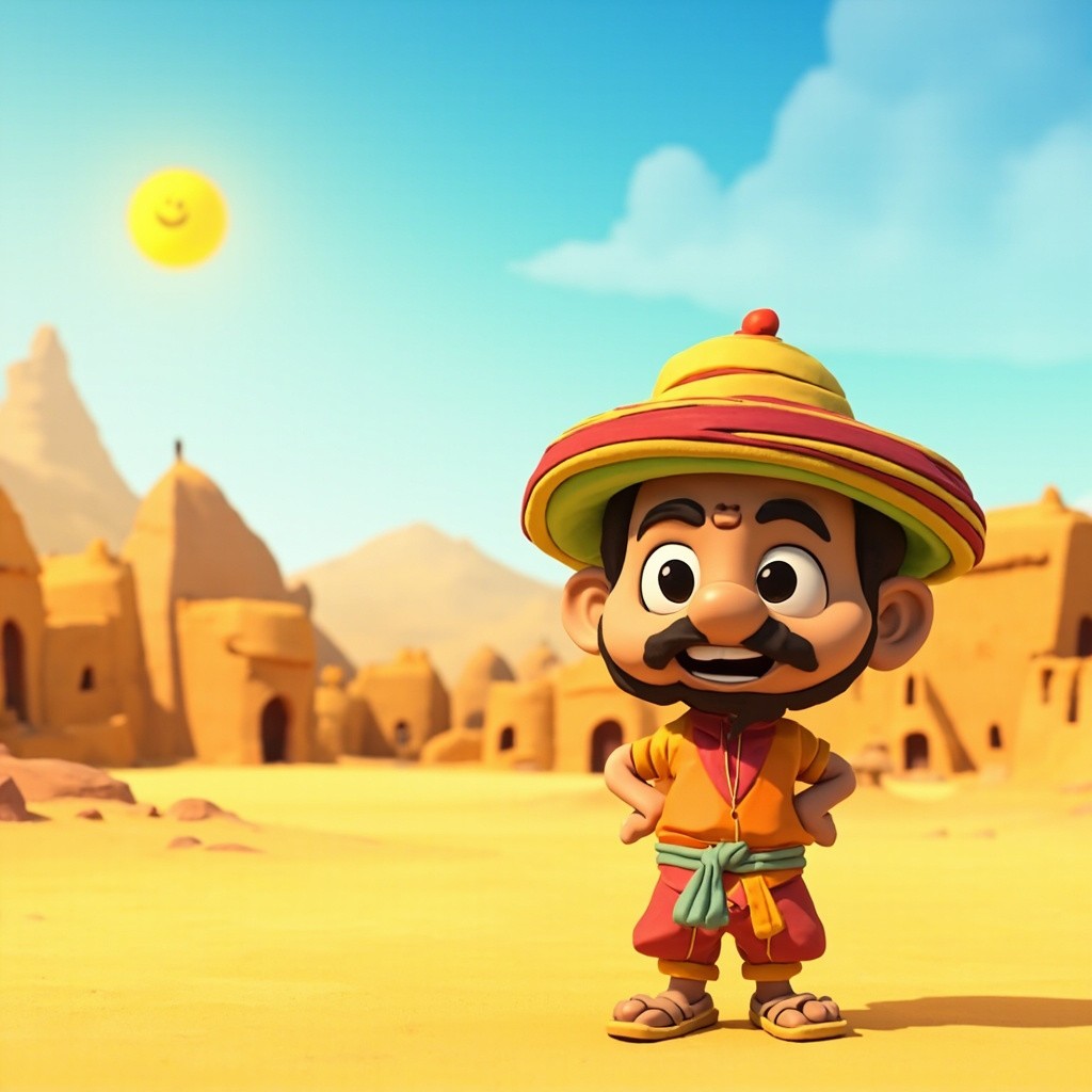 3D Cartoon of Rajasthan Desert Village with Cheerful Farmer