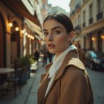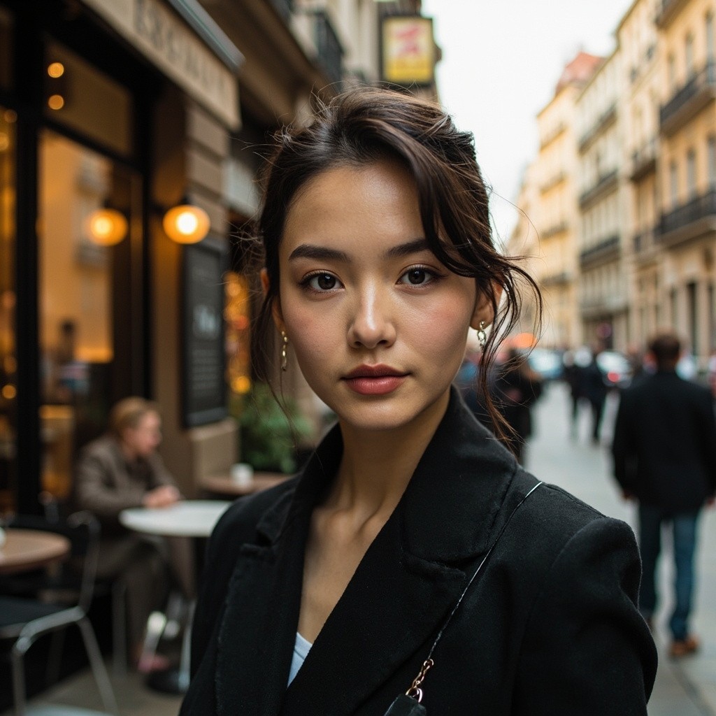 "Create a high-quality foreign aesthetic portrait in a modern European city. Soft natural lighting, cinematic depth of field, and elegant street background with cafes, vintage buildings, and warm tones. The subject is stylishly dressed, minimalistic fashion, realistic skin texture, ultra-detailed eyes, sharp focus, and premium photography style. Shot on 85mm lens, f/1.8, HDR, 8K resolution, professional color grading."