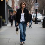 create a 40 year old women size 12 wearing black tween Chanel Jacket, white tee shirt, Bootcut denim jean, tan ballet flat show with black cap toe, chunky gold jewelry of 3 chains walking down a city street. hair should be short and brown. She should look very chic and fashionable. No wrinkled clothes.