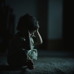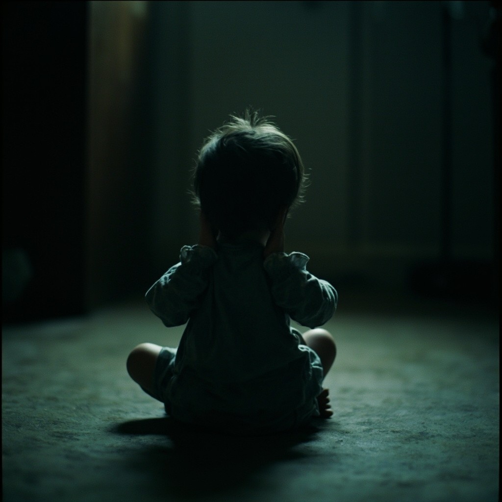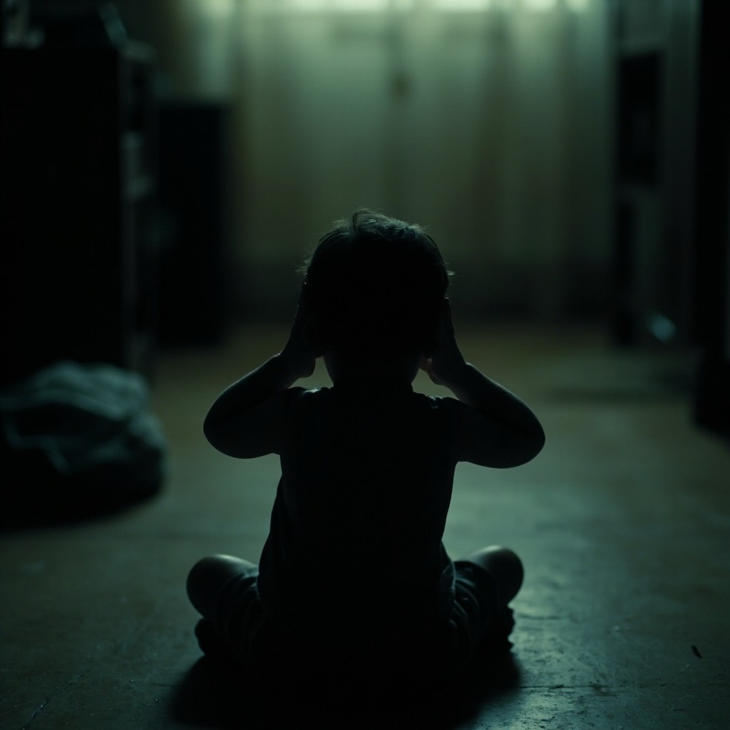 Child Sitting on Floor Covering Ears in Dimly Lit Room