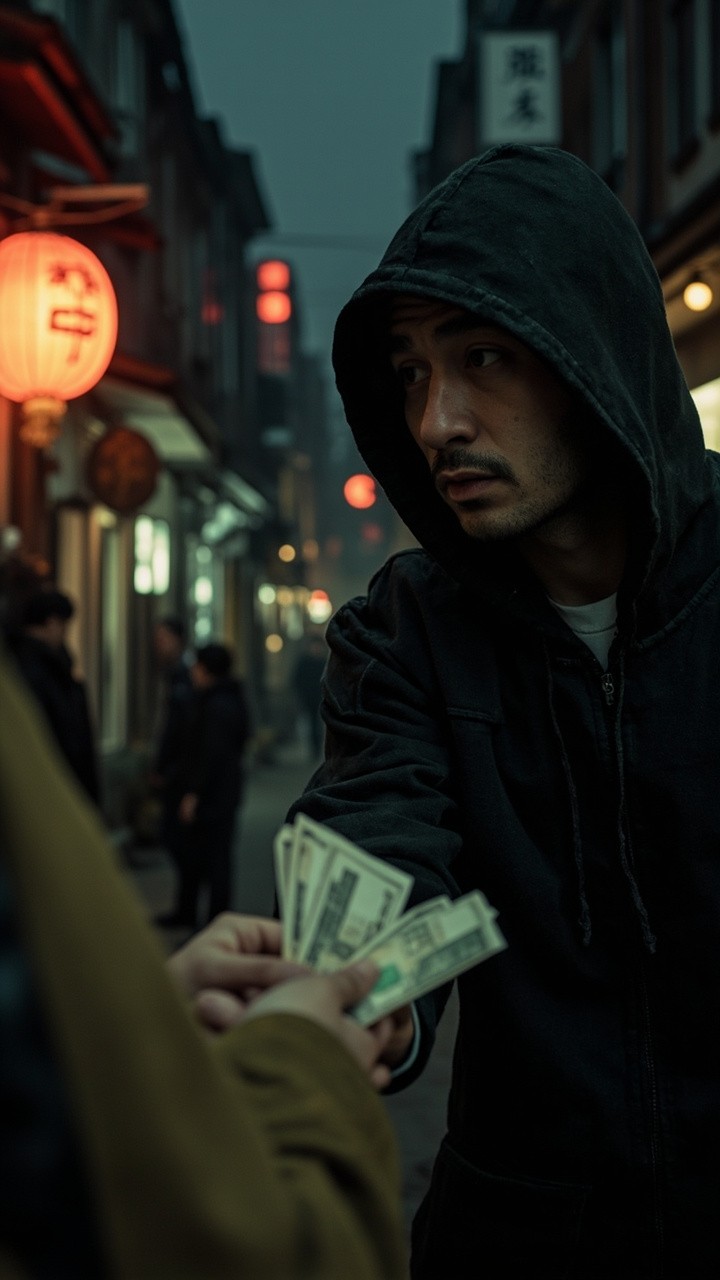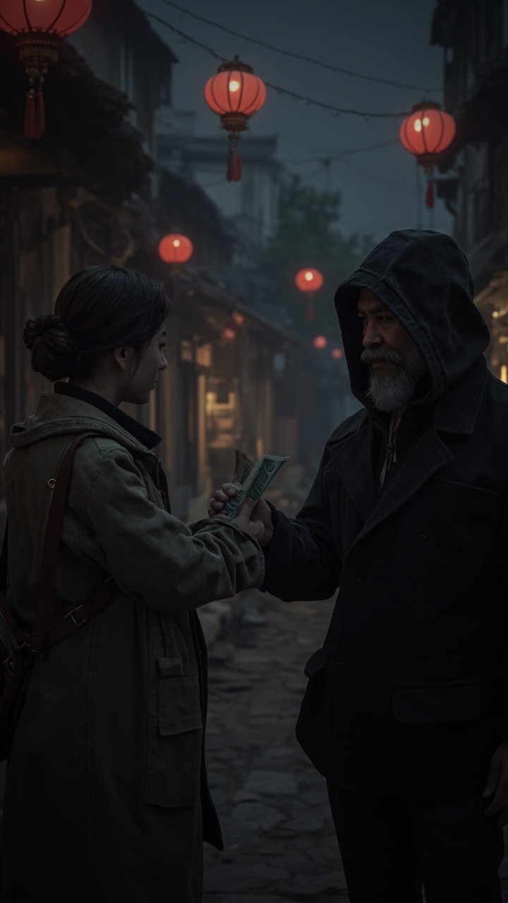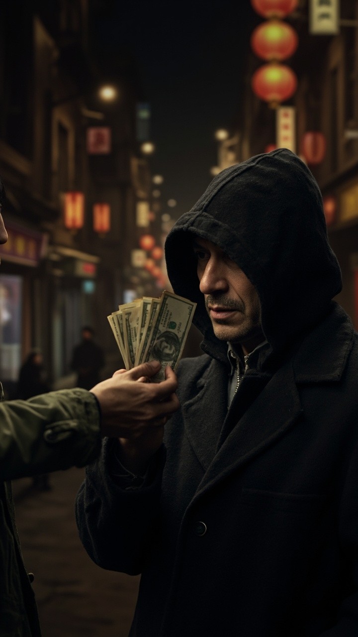 Chinese Man Handing Cash to Hooded Figure on Old Chinese Street at Night