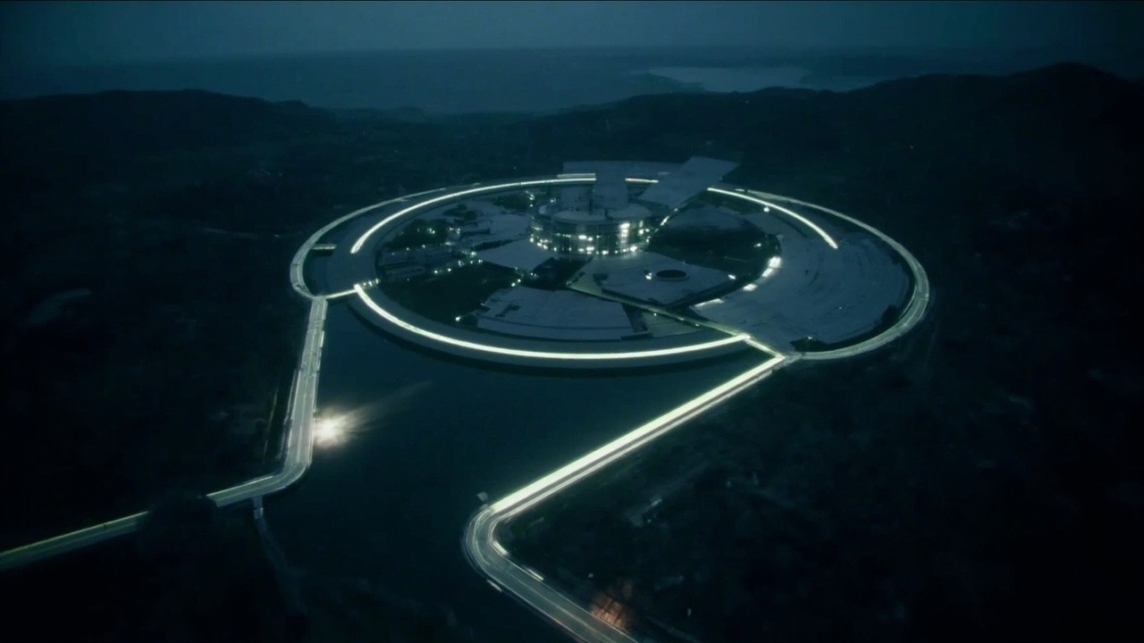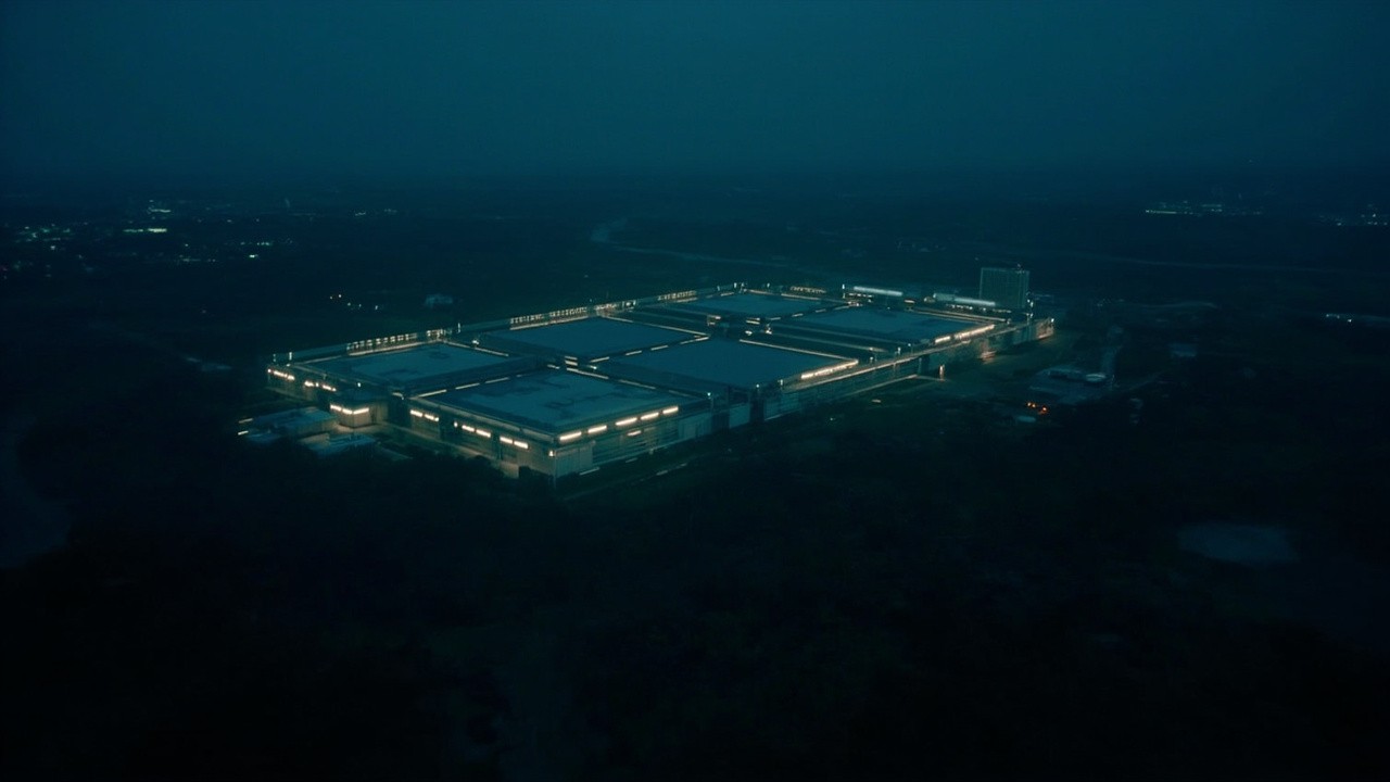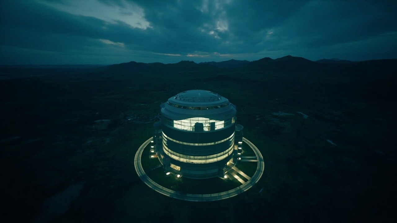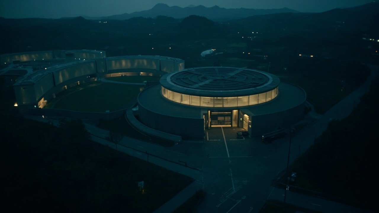 Drone Shot of CERN Facility Exterior in Dark Geneva