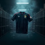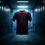 Football Jersey Display in Digital Locker Room with Abstract Data Graphics