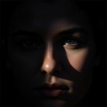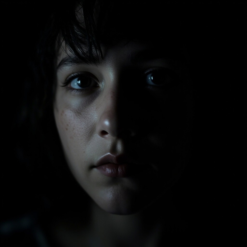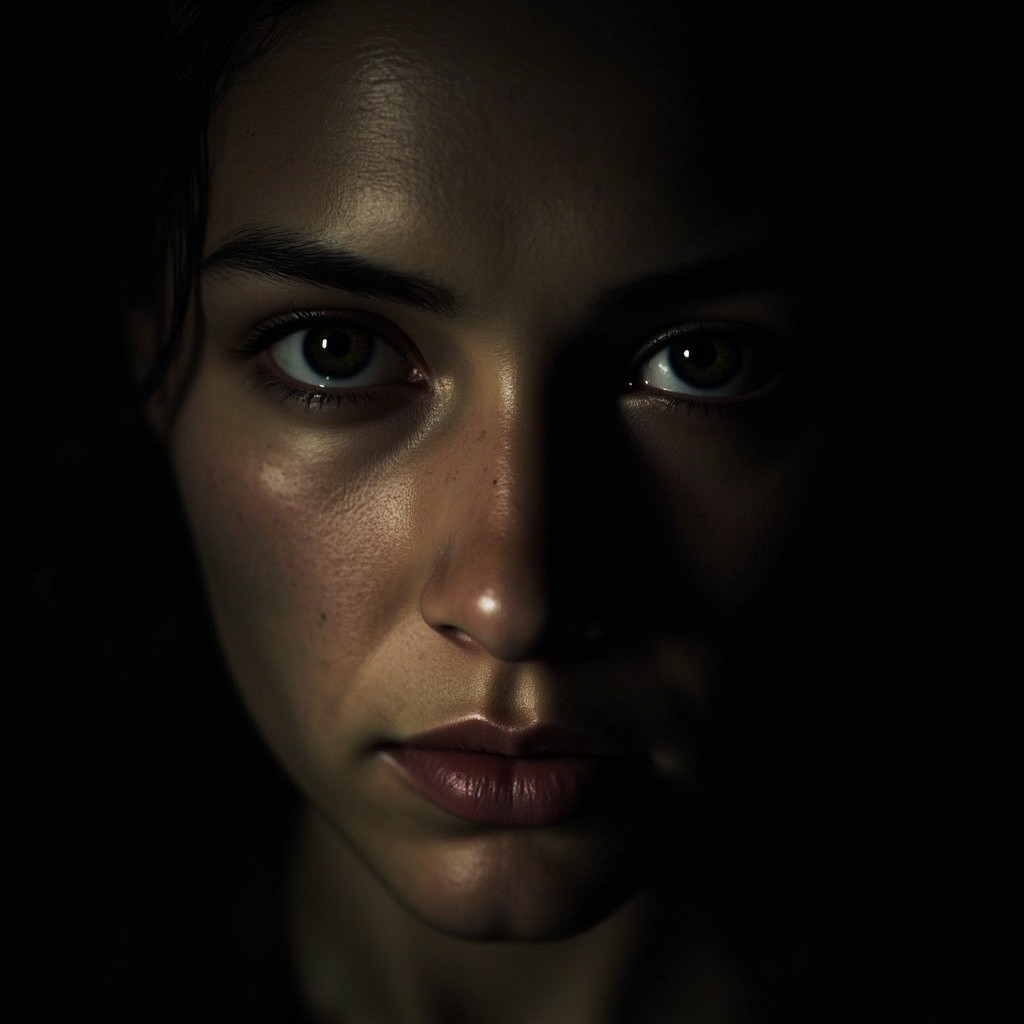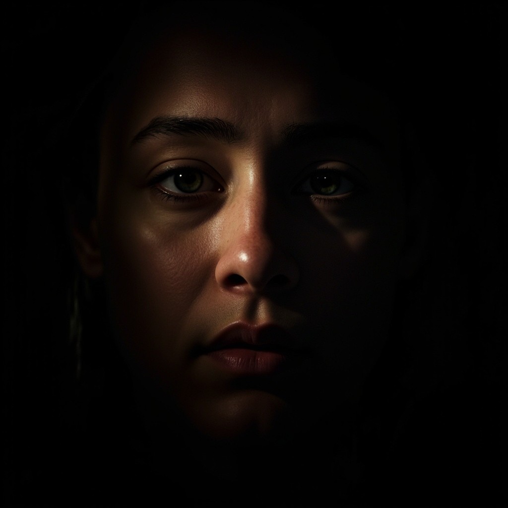 Close-Up Neutral Human Face, Half Shadowed, Deep Eye Contact, Dark Background