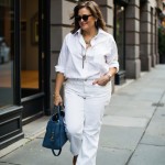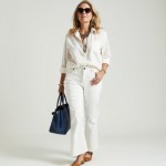 imagine a pretty 40-year-old stylish woman who is plus size 10 and pretty. She has a full round belly. Her hips are narrow. she is wearing a crisp blut shirt buttoned and partially tucked into her white fitted flared jeans. she is wearing tan ballet flats and a blue bag. she is wearing sunglasses and 2 long heavy chains around her neck. she is classic.