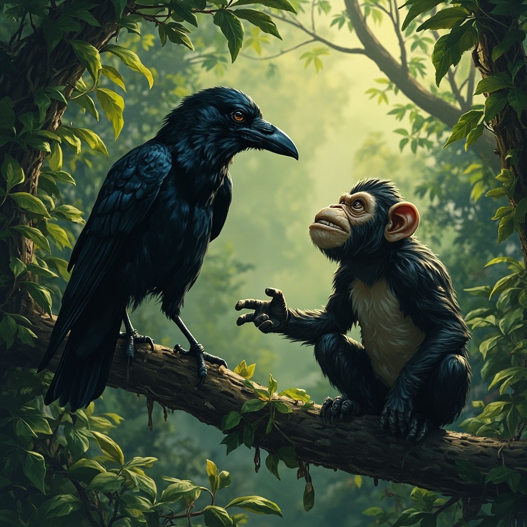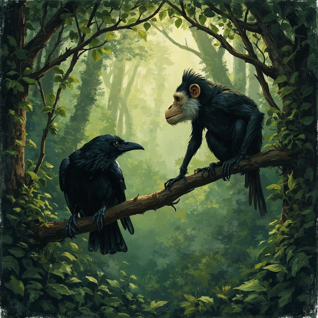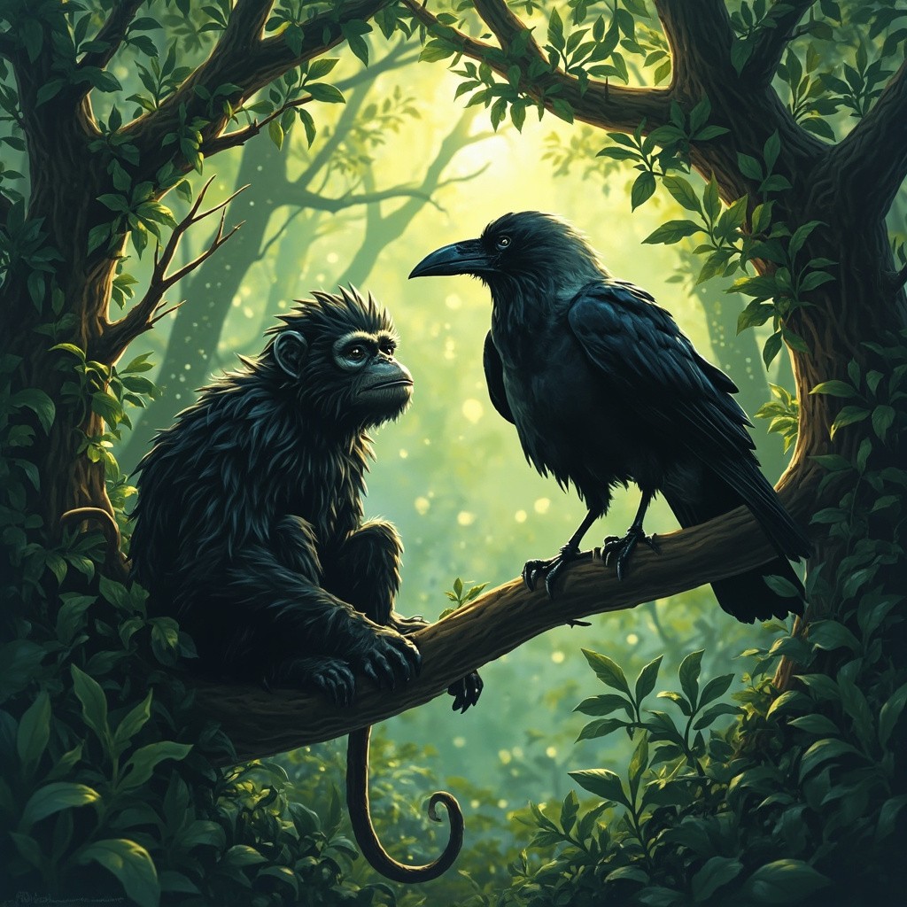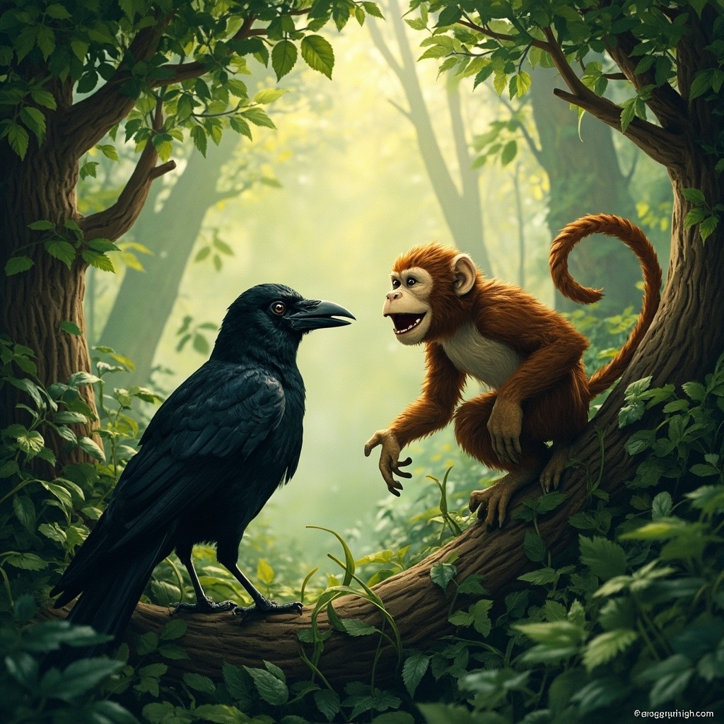 Clever Crow and Mischievous Monkey in Dense Jungle