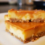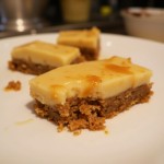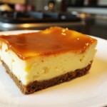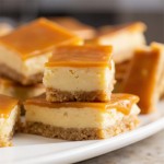 Close-Up Right View of Caramel Cheesecake Bars on White Plate in Kitchen