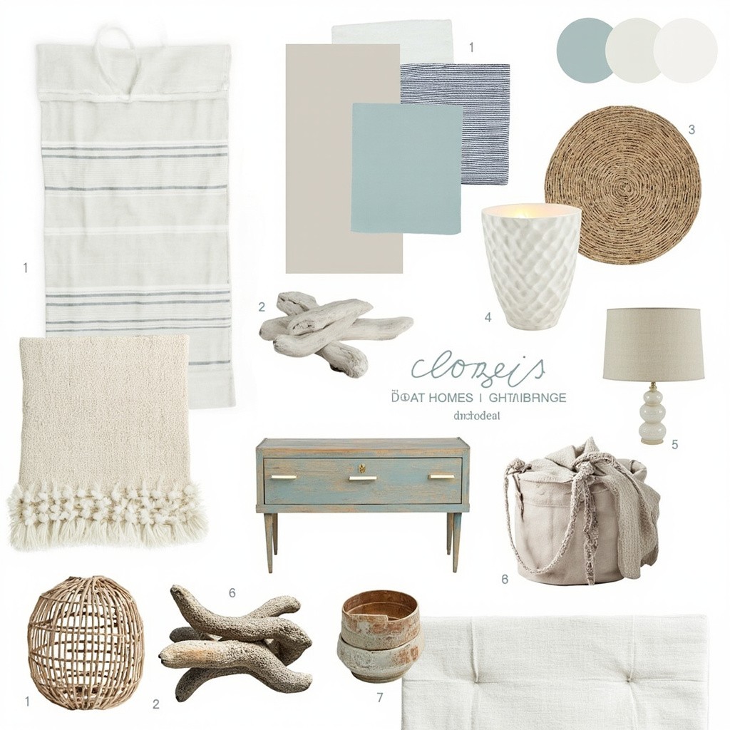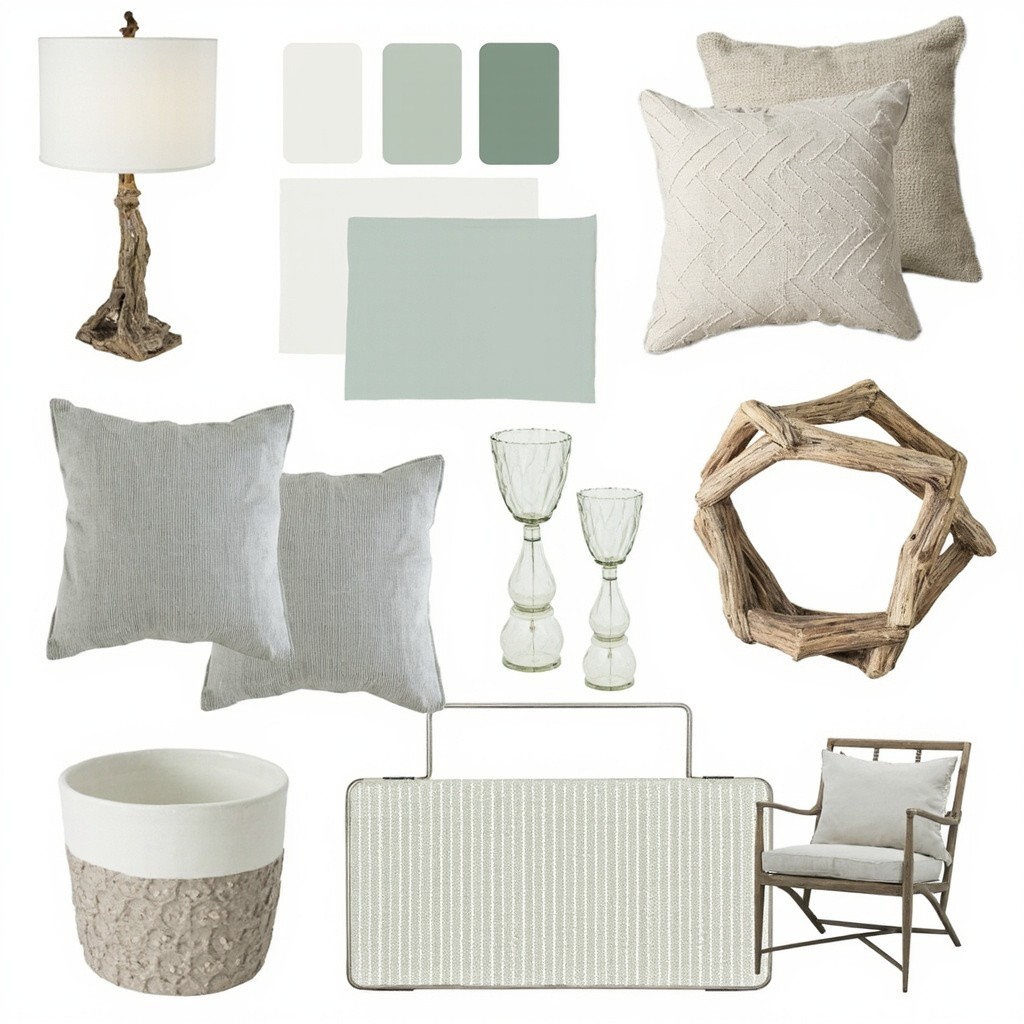 Coastal Home Décor Mood Board with Driftwood Tones and Sea Glass Accents