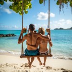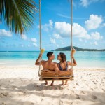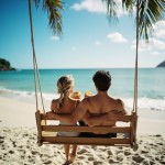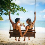 Couple Enjoying Coconut Drinks on Le Morne Beach Swing, Mauritius