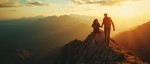 A courageous couple hiking up a steep mountain ridge together, with determined expressions as they climb toward the summit. The late afternoon sun casts a warm golden light across the rugged terrain. They walk side by side along the mountain edge, surrounded by a breathtaking panorama of distant peaks under a vivid sky. The moment captures unity, love, adventure, and perseverance in nature’s grandeur. Mid-distance view, not a close-up. The scene should feel inspiring and cinematic, with dramatic lighting and rich detail.