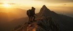Couple Hiking Mountain Ridge Under Golden Afternoon Light