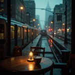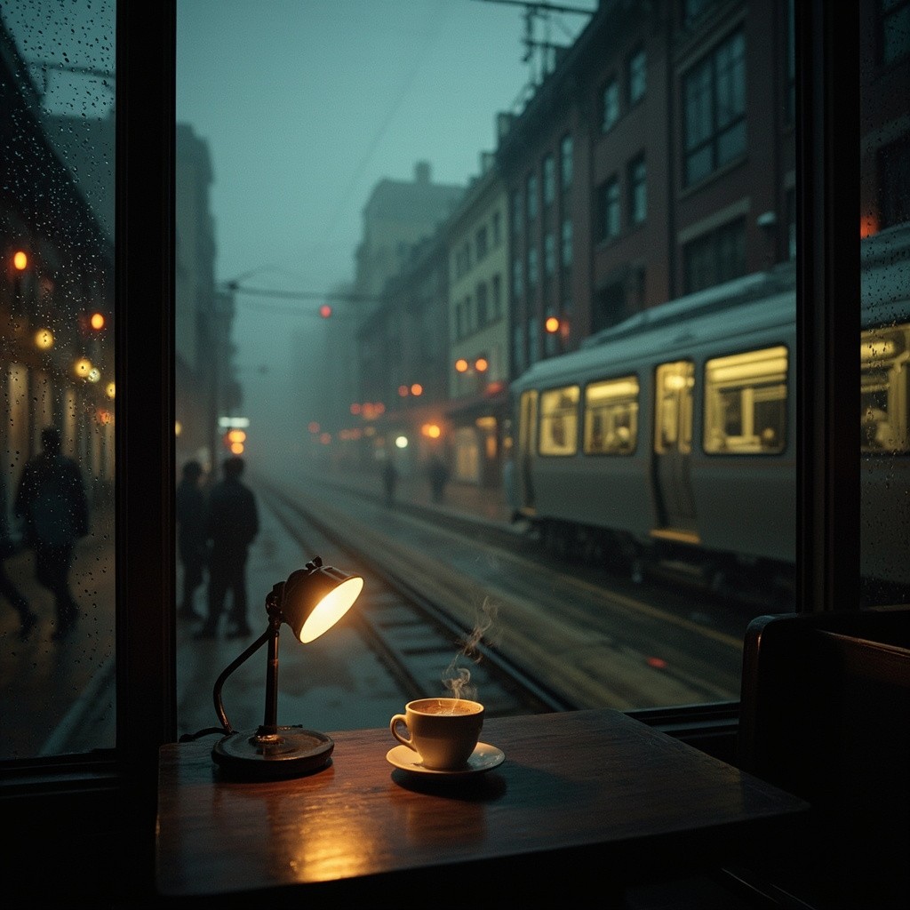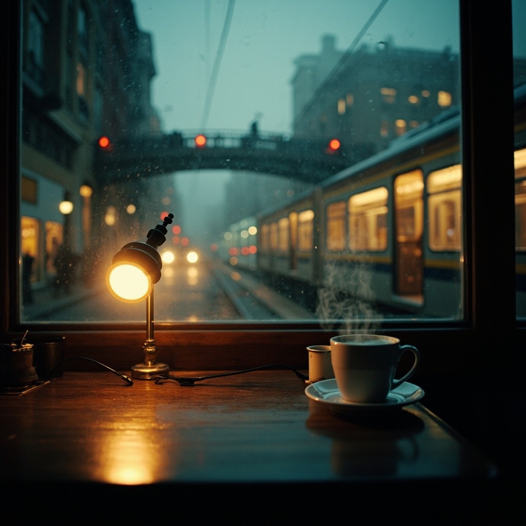 Interior view from a cozy café at dusk, looking out a large rainy window onto a foggy cityscape with a passing elevated train, warm ambient lighting from a small table lamp reflecting on a wooden table, a steaming cup of coffee placed near the window, soft cinematic lighting, moody atmosphere, soft blues and warm oranges, shot on ARRI Alexa, shallow depth of field, richly detailed, rainy urban evening vibes